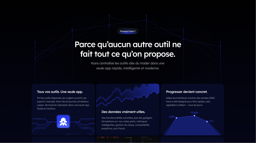 We teamed up with Kara Trading to design a high-converting landing page that reflects the quality and ambition of their product. Every section was crafted to highlight their innovative tools. Along the way, we produced a full set of custom assets all tailored to elevate the product’s story and drive user engagement.